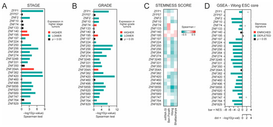 The association between KRAB-ZNF expression and tumor dedifferentiation status. (A) The association between KRAB-ZNF expression and tumor stage—either lower (green) or higher stage (red), as determined with Spearman correlation test (−log10(p-value)). (B) The association between KRAB-ZNF expression and tumor grade—either lower (green) or higher grade (red), as determined with Spearman correlation test (−log10(p-value)). (C) The heatmap of Spearman’s correlation between KRAB-ZNFs’ expression and four distinct stemness indices (mRNA-SI, Ben-Porath signature, Wong signature, Bhattacharya signature). Red and green denote positive and negative correlation, respectively. Only statistically significant associations are shown (p < 0.05). (D) The Gene Set Enrichment Analysis (GSEA) using genes significantly correlated (FDR < 0.01) with KRAB-ZNF level in KIRC patients was performed with the stemness signature (Wong_ESC_Core) as a reference. Bar—the normalized enrichment score (NES). Grey dot—statistical significance (−log10FDR).