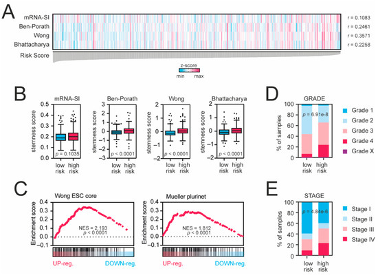 Next, we compared the gene expression profiles of high- and low-risk KIRC patients (Figure S7A) and observed significant enrichment of immune response-associated terms followed by significant enrichment of stemness-associated biological terms in the high-risk KIRC cohort (Figure S7B). We observed that our risk score was significantly correlated with the stemness-associated transcriptome-based signatures (mRNA-SI, p = 0.0139; Ben-Porath, p < 0.0001; Wong, p < 0.0001; Bhattacharya, p < 0.0001; Figure 4A,B). The GSEA analysis also confirmed significant enrichment of gene expression profiles of high-risk KIRC patients with previously defined stemness signatures (Figure 4C). Moreover, among the high-risk patients, the frequencies of higher-grade (Figure 4D) and higher stage (Figure 4E) tumors were significantly elevated (p = 6.91 × 10−8 and p = 4.838 × 10−6, respectively), suggesting that high-risk tumors exhibit dedifferentiated phenotype.