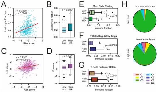 Next, we compared the level of transcriptome-based immune-related scores, namely the leukocyte fraction and the leukocyte infiltration signature (LIS) scores [25], with the level of our risk score and observed a significant positive correlation (Figure 5A,B). Higher-risk patients exhibit higher levels of both immune scores (Figure 5C,D). Among all tested 22 immune populations estimated by the CIBERSORT [19] (Figure S8), we observed a significant increase in regulatory T cells (p = 0.0009) (Figure 5E) and follicular helper T cells (p = 0.0014) (Figure 5F) followed by a decreased number of resting mast cells (p = 0.0371) (Figure 5G) in high-risk KIRC patients. Furthermore, among the high-risk KIRC patients, the frequencies of C1 (“wound healing”), C2 (“IFN-γ dominant”), and C6 (“TGF-β dominant”) immune subtypes were significantly elevated (p = 0.0054) when compared to low-risk KIRC cohort. Taken together, these results indicate that high-risk KIRC tumors exhibit a more stem cell-like phenotype with accumulated immune-suppressive cells and signaling.