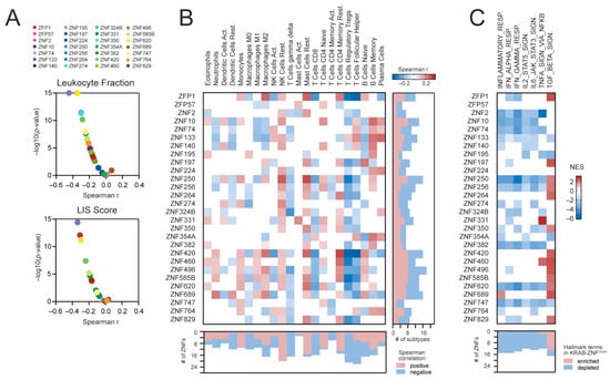 The association between KRAB-ZNF expression and the immune cell infiltration in KIRC. (A) The Spearman correlation of the leukocyte fraction (upper panel) or the lymphocyte infiltration signature (LIS) score (bottom panel) and KRAB-ZNF expression in TCGA KIRC patients. (B) The Spearman correlation of immune cell infiltration level with the expression of KRAB-ZNFs in KIRC. Blue and brown present negative and positive correlations, respectively. The right panel denotes the number of immune cell subtypes positively (brown) or negatively (blue) associated with the expression of distinct KRAB-ZNFs. The bottom panel denotes the number of KRAB-ZNFs positively (brown) or negatively (blue) associated with the abundance of distinct immune cell subtypes. (C) The heatmap presents the normalized enrichment scores (NES) for 7 selected immune-associated Hallmark terms (v7.4) from the GSEA analysis of KRAB-ZNF-associated transcriptome profiles. White—no statistical significance (p > 0.05) or no DEGs detected. The bottom panel denotes the number of KRAB-ZNF-associated transcriptome profiles with either enriched (brown) or depleted (blue) immune-associated terms.