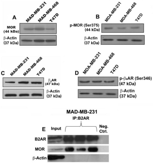 Breast cancer cells express μ-opioid receptor (MOR) and β2-adrenergic receptor (B2AR) and their dimers. Upper panel pictures show immunoblotting data of MOR (A) and phospho-MOR (B) in human breast cancer cells MDA-MB-231, MDA-MB-468, and T47D. Middle panel pictures are B2AR (C) and phospho-B2AR (D) in these cells. Lower panel pictures are immunoblotting data of B2AR or MOR after performing immunoprecipitation (IP) with B2AR on MDA-MB-231 cells (E). Input is the control immunoblotting of protein lysate and IP results are shown in triplicate. β2-actin is used as a house-keeping control protein.