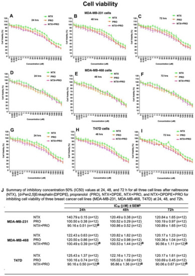 Propranolol (PRO) and naltrexone (NTX) produce synergistic effects on reduction in breast tumor cell viability. Cells were cultured in the presence of the indicated doses of a single drug (NTX or PRO) or drug combination (NTX + PRO) on viability of MDA-MB-231 cells (A–C), MDA-MB-468 cells (D–F), and T47D cells (G–I) after 24, 48, and 72 h. Cell viability was analyzed by MTT assay and data presented as mean ± SEM (n = 12). The values of the inhibitory concentration required to arrest 50% of the cells (IC50) were calculated and presented in (J).