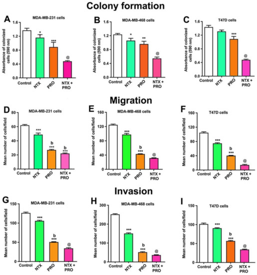 The effectiveness of a 100 µM dose of these two agents on the cell invasion of all cell lines is shown in Figure 2G–I and Figure S1G–I. The results show that NTX and PRO alone and in combination decreased cell invasion in these three cell lines.