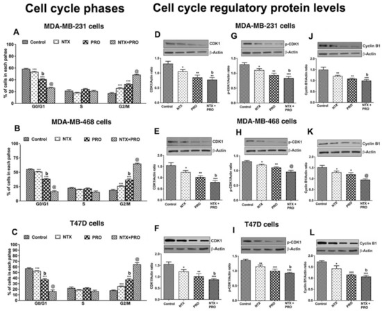 PRO and NTX increase G2/M arrest (A–C) and modulate levels of G2M-regulatory proteins (D–L) in MDA-MB-231, MDA-MB-468, and T47D cells. (A–C). Cells were treated with a 100 μM concentration of the drugs alone or in combination or vehicle alone for 48 h. After the treatment period, cells were stained with PI and analyzed for cell cycle distribution using flow cytometry. Proportions of cells in each phase were quantified and the values are shown as histograms. (D–L). After the drug treatments, some cells were extracted and used for Western blot analysis of CDK, phospho-CDK, and Cycline B1. Representative blots are presented on the top and mean densitometric values are presented as ratio of β-actin in the histograms. Data presented are mean ± SEM (n = 5–6 samples/group) and were analyzed using one-way ANOVA with the Newman–Keuls multiple comparisons post hoc test. *, p < 0.05, **, p < 0.01, ***, p < 0.001 compared to control, b, p < 0.05, compared with NTX. @, p < 0.05, compared with the rest of the groups. (Figure S3: Original gel blots).