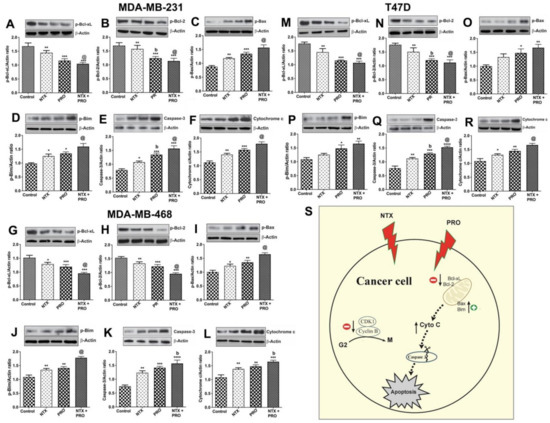 PRO and NTX modulate levels of apoptosis-related protein in MDA-MB-231, MDA-MB-468, and T47D cells. Cells were treated with a 100-μM concentration of the drugs alone or in combination or vehicle alone for 48 h. After the treatment period, cells were extracted and used for Western blot analysis of anti-apoptotic p-Bcl-xL (A,G,M) and p-Bcl2 (B,H,N), effector proteins such as p-Bax (C,I,O), pro-apoptotic molecule p-Bim (D,J,P), effector caspase 3 (E,K,Q) and cytochrome c (F,L,R) levels. Representative blots are presented on the top and mean densitometric values are presented as ratio of β-actin in the histograms. Data presented are mean ± SEM (n = 5–6 samples/group) and were analyzed using one-way ANOVA with the Newman–Keuls multiple comparisons post hoc test. *, p < 0.05, **, p < 0.01, ***, p < 0.001, ****, p < 0.0001 compared to control, b, p < 0.05, compared with NTX. @, p < 0.05, compared with the rest of the groups. Schematic illustration of the proposed mechanism of action of naltrexone and propranolol on induction of apoptosis in human breast cancer cells (S). (Figure S3: Original gel blots).