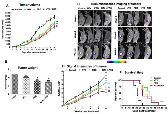 To monitor the effect of drugs on tumor shrinkage/growth in real time, we used MDA-MB 231/Luc-GFP cells in a subcutaneous flank tumor model for bioluminescence imaging [31] in nude rats. We observed that the bioluminescent intensity of the tumor in the control group generally showed an increasing trend similar to that of the tumor volume (Figure 6A,C,D). The combination therapy (NTX + PRO) resulted in a decrease in both luminescent signals and bioluminescent intensity over the 6-week period of treatment.