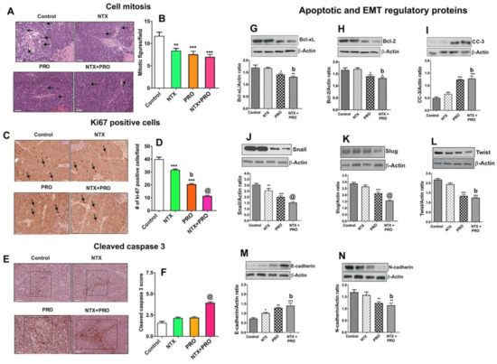 Treatment with PRO or NTX decreases cell mitosis, cell proliferation, cellular apoptosis, and epithelial–mesenchymal transition (EMT) in tumor xenografts. Drug-treated MDA-MB-231-cell-derived xenografts in nude rats were collected and employed for histological determination of cell mitosis (A,B); immunohistochemical measurements of Ki67 (C,D) and cleaved caspase 3 (E,F); and Western blot measurements of Bcl-xL (G), Bcl-2 (H), and cleaved caspase 3 (I); Snail (J), Slug (K), and Twist (L); and E-cadherin (M) and N-cadherin (N). Changes in tumor histopathology and protein immunohistochemistry are shown by presenting representative pictures (arrows are used to denote the cellular changes whereas a dotted square is used to show the area of intensity). Images represented as 20× magnification with 50 μm scale bars. Histological changes were counted by densitometry and presented in histograms. Data are means ± SEM obtained from 3 serial sections of 5 to 6 animals in each group. Western blot analysis of protein levels was measured by densitometry and presented as ratio of β-actin, a house-keeping protein, in histograms. Data presented are mean ± SEM (n = 5–6 animals/group) and were analyzed using one-way ANOVA with the Newman–Keuls multiple comparisons test. *, p < 0.05, **, p < 0.01, ***, p ≤ 0.001 compared to control, b, p < 0.01, compared with NTX. @, p < 0.001, compared with the rest of the groups. (Figure S3: Original gel blots).