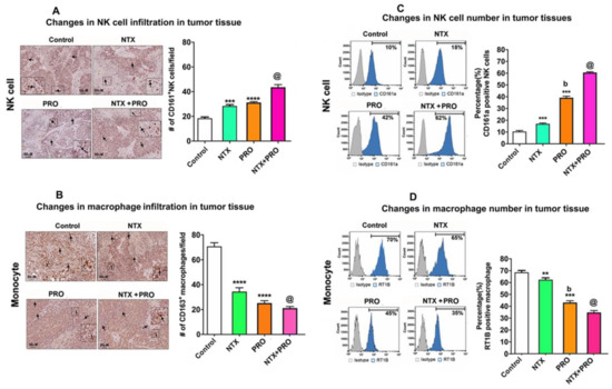 The tumor xenograft study was conducted in athymic nude rats, and therefore the major immune defense mechanism against cancer is controlled by the innate immune system in this host [36]. PBMCs and spleen tissue of xenografted rats treated with different treatments and control animals were used for screening immune cell populations by flow cytometry to quantitate the percentage (%) of CD161a+ NK cells in PBMCs (Figure 8A), CD11b+ monocytes in PBMCs (Figure 8B), CD161a+ NK cells in the spleen (Figure 8C), and RT1B+ macrophages in the spleen (Figure 8D). Treatment with NTX or PRO alone increased NK cell numbers in PBMCs and the spleen. The effects of these drugs were potentiated when drugs were combined. In contrast, monocyte numbers in PBMCs were decreased following NTX + PRO treatments, and macrophage numbers in the spleen were reduced following PRO and NTX + PRO treatments.