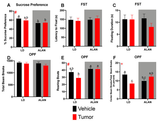 Mammary tumors and ALAN alter behavior: (A) ALAN significantly reduced sucrose preference. No effect was seen in (B) latency to float, (C) floating duration, or (D) total locomotor activity. (E) Tumor-bearing LD-housed mice displayed a significantly reduced number of rearing bouts relative to both ALAN-housed groups. (F) LD-housed tumor-bearing mice demonstrated significantly reduced central tendency relative to LD-housed vehicle-treated mice. This effect was normalized via housing in ALAN. Error bars represent SEM; # main effect of lighting, + lighting by day interaction; (A–F) two-way ANOVA; Fisher’s LSD multiple comparisons test. Graph bars that do not share a letter are statistically significantly different at p < 0.05. (a)—LD veh vs. ALAN tumor at p < 0.05. (b)—LD veh vs. ALAN veh at p < 0.05. (c)—LD tumor vs. ALAN veh at p < 0.05. n = 13–15 per group.