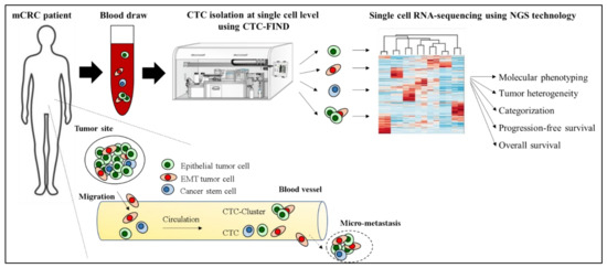 RNA-sequencing (RNA-seq) technologies have been widely used for analyzing gene and transcript expression levels of bulk cells and had a pivotal role in the development of the CMS classification, which is associated with molecular features and clinical outcomes in CRC [6,7]. Furthermore, recently developed single-cell RNA sequencing (scRNA-seq) technologies provide a means for the analysis of any cell type at a single cell level and open the possibility to understand tumor heterogeneity unbiasedly using not only tumor tissue but also CTCs [8,9,10]. However, little is known about the characterization of CTCs in patients with metastatic colorectal cancer (mCRC) using scRNA-seq [11].