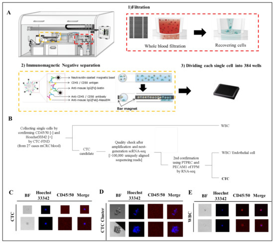 Separation of CTCs and leukocyte or endothelial cells. (A) Technical concept using CTC-FIND for single cell isolation. (B) Scheme of cell classification. (C–E) Representative fluorescence image of CTCs detected in clinical blood specimens. The blood samples (8 mL) collected from patients with mCRC were evaluated by fluorescence microscopy after separation to single cells by CTC-FIND. Specimens were enriched and stained with Hoechst 33342 (pseudo colored blue) and negative markers composed of anti-CD45 and anit-CD50 antibodies (pseudo colored red), followed by the acquisition of fluorescence images for each marker and digital overlay of the two images (merge). Hoechst 33342-positive and CD45/50-negative CTCs were counted and collected from each specimen. Gallery of CTCs (C), CTC clusters (D) and leucocytes (E). Original magnification, ×500.