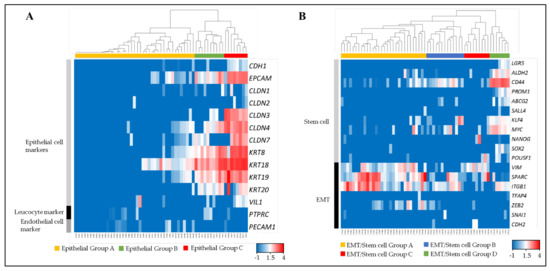 Fifty-nine single CTCs and CTC-clusters were divided into three groups (Epithelial Group A, B and C) by clustering analysis, using 12 epithelial cell markers (CDH1, EPCAM, CLDN1, CLDN2, CLDN3, CLDN4, CLDN7, KRT8, KRT18, KRT19, KRT20 and VIL1) [19,20,21,22], a leucocyte marker (PTPRC), and an endothelial cell marker (PECAM1) (Figure 3A).