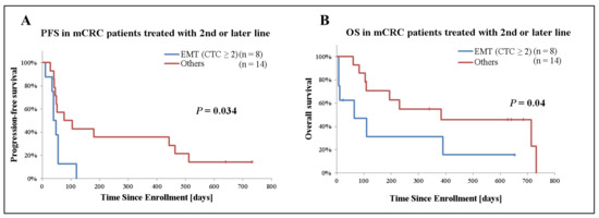 Kaplan–Meier plots of 22 mCRC cases receiving second- or later-line treatment stratified by presence of EMT CTCs. (A) Analysis of progression-free survival (PFS), (B) overall survival (OS). Patient receiving second- or later-line of treatment were grouped based on the presence and number of EMT CTCs. Patients who only had detectable EMT CTCs and 2 or more CTCs were categorized as “EMT (CTC ≥ 2)”. ‘Others’ indicates patients with <2 EMT CTCs or no detectable CTCs. p-values were calculated with the Generalized Wilcoxon test and are shown in the graph.