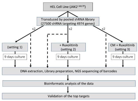 We screened the HEL cells under various conditions using the Decipher Human Module 1 shRNA library (Cellecta, Mountain View, CA, USA) which comprises 5043 targets of major intracellular signalling pathways (corresponding to 4974 reliable genes) with 27,500 shRNA (26 937 shRNAs targeting the reliable genes). We optimised the methodology such that the final number of infected cells would be at least 200 to 1000 times the complexity of the shRNA library. Each experiment was performed in duplicate from the transduction stage forward, and hence the replicates reflect not only technical sequencing variation but also variation in the entire shRNA integration process. Ruxolitinib has previously been shown to have a strong effect in reducing the phosphorylation of JAK2, STAT3 and STAT5 within 2–4 h from exposure, at a concentration of 100 nM [,]. We chose the low inhibitory dose of 150 nM for the 9-day selection period of the pooled-shRNA library screen to allow for inhibition of JAK2/STAT5 phosphorylation without a significant reduction in the number of cells, allowing the opportunity for cells to activate alternative protective pathways. Cell transduction was performed as described previously []. At 72 h, cells were analysed for red fluorescent protein (RFP) expression (the fluorescent marker of the shRNA construct) and experiments with a transduction efficiency of >40% and <10% were excluded. One third of the cells were snap-frozen for use as control and the rest were cultured for 9 days in the presence of 2 µg/µL puromycin to enrich the transduced cells in three different settings: (1) RF10 medium (2) RF10 + ruxolitinib (150 nM); (3) HS-5 CM only + ruxolitinib (added daily at a concentration of 150 nM) for the first 3 days, followed by the combination of HS-5 CM (50% of the volume) and RF10 (50% of the volume) + ruxolitinib. The combination of CM with RF10 for the last 6 days of culture in setting 3 was to avoid the depletion of the medium from metabolic components. Cells were collected at day 9 [] (Figure 1).