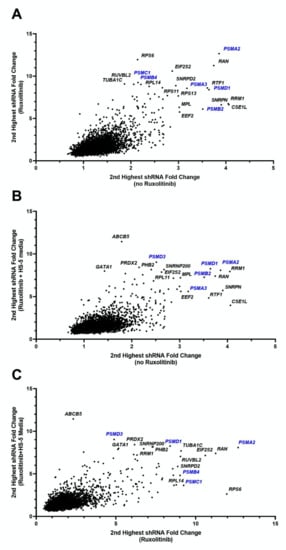 Fold change of shRNAs for HEL cell line under various conditions. Each figure shows the second highest fold change for shRNAs targeting each of 4974 genes, showing comparisons for each combination of conditions. Genes in the uppermost right corners indicate genes which under both of the compared conditions had high shRNA depletion at follow-up compared to baseline, indicating essentiality of the gene for HEL cells survival. (A) Fold change of ruxolitinib treated cells to baseline (vertical axis) versus cells cultured without ruxolitinib to baseline (horizontal axis). (B) Fold change of HS-5 media plus ruxolitinib treated cells to baseline (vertical axis) versus cells cultured without ruxolitinib to baseline (horizontal axis). (C) Fold change of HS-5 media plus ruxolitinib treated cells to baseline (vertical axis) versus cells cultured with ruxolitinib (and no HS-5 media) to baseline (horizontal axis). The first replicate (run 1) values are shown for each setting. These data indicate a significant abundance of proteasome genes (in blue font), requisite for the survival of HEL cells regardless of microenvironment or exposure to ruxolitinib.