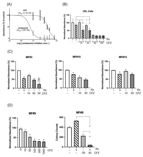 Cell line and primary MF cells’ sensitivity to proteasome inhibitors. (A) The IC50 was measured for CFZ and bortezomib after measuring the proliferation and viability at 72 h using MTS assay. (B) Sensitivity of HEL cells to various doses of CFZ alone or in combination with 300 nM ruxolitinib (Rx). Combination of ruxolitinib with CFZ at 10 or 20 nM significantly increased the inhibition of the HEL cells compared to either ruxolitinib (p value: 0.01 and 0.005 respectively) or CFZ (p value: 0.001 or 0.01 respectively) after 72 h. * represents p value < 0.05 for the comparison between the combination therapy and either treatment. The inhibition at 50 or 100 nM CFZ alone or in combination compared to control was significant. The Y axis represents the normalized absorbance to untreated control. (C) CD34+ cells from 3 MF patients showed sensitivity to 10 and 50 nM CFZ as measured by MTS assay at 24 h (For MF#3 the viability of the cells at 50 nM CFZ was also measured at 72 h). Y axis represents the % of absorbance relative to the untreated control. The columns represent the mean from at least 3 technical replicates (* represents a significant p value in comparison to untreated control). Please see the p values of the comparison between any two conditions in Table S3. (D) (Left) Ruxolitinib resistant triple-negative MF#9 showed sensitivity to CFZ, and this sensitivity became significant at 50 nM (p = 0.0001) with higher doses of CFZ leading to higher suppression as measured by MTS assay at 48 h (results are presented as mean and error bars of at least 3 replicates). The Y axis represents the normalised absorbance of the MTS assay. (Right) Colony formation assay shows CFZ has a significant inhibitory impact on stem/progenitor cells at 50 nM which increased several times in combination with ruxolitinib. The data for each condition was achieved by reading the number of colonies from two dishes (duplicates for each condition) and presented with error bars (*: p value < 0.05).