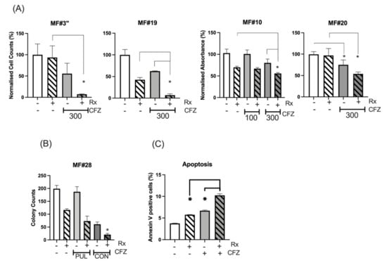 Continuous and pulsed exposure of MF CD34+ cells to CFZ. (A) CFZ 1h-pulsed exposure potentiated the ruxolitinib effect on the inhibition of cell proliferation or viability of MNC from MF#3”, MF#19 and MF#20 and CD34+ cells from MF#10. The cell count (MF#3” and MF#19) and the MTS assay measurement (MF#10 and MF#20) was performed at 72 h (MF19, MF#20 and MF#10) and at 48 h (MF#3) from pulsed exposure (refer to Figure S3 for experiment description). The Y axis represents the normalised cell counts (MF#3 and MF#19) or normalised absorbance (MF#10 and MF#20) expressed as percentage of the control. Cell viability was significantly reduced with 300 nM 1h-pulsed CFZ compared to untreated control (p value < 0.05). The reduction of cell viability by ruxolitinib was also significant (p value < 0.05) except for MF#3” and MF#20 (* represents p value < 0.05). Please see the p values of the comparison between any two conditions in Table S4. (B) The colony formation assay was set up for CD34+ cells (MF#28) after 24 h of continuous (CON) or 1h-pulsed exposure (PUL) to CFZ and in the presence or absence of ruxolitinib. The data for each condition was achieved by reading the number of colonies from two dishes (duplicates for each condition) and presented with error bars (*: p value < 0.05 comparing ruxolitinib versus combination treatment). (C) The % of apoptotic cells in ruxolitinib, 1h-pulsed CFZ and their combination in MF CD34+ cells at 24 h. This experiment was performed in duplicate and showed both CFZ and ruxolitinib (Rx) to increase apoptosis in the MF cells, with the highest effect obtained with drug combination. The concentration of ruxolitinib (RX) was 300 nM for all the experiments in this figure. The p value for comparing the two conditions was: control versus Rx, p = 0.001; control versus CFZ, p = 0.0004; Rx versus CFZ, p = 0.028; Rx versus Rx+CFZ, p = 0.0001; CFZ versus Rx+CFZ, p = 0.0002.