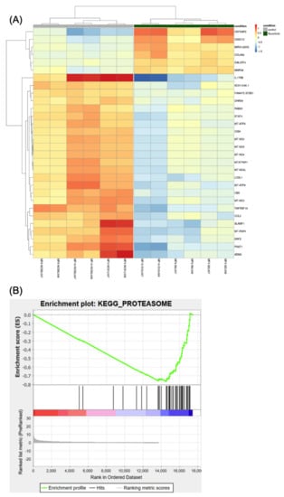 The differential expression analysis. (A) Heatmap showing the 30 most statistically relevant genes which are differentially expressed between the ruxolitinib-treated cells and the untreated control. The heatmap is organized into two parts grouping the untreated samples (the first 6 columns on the left side of the heatmap, also indicated by a grey bar at the top of the heatmap) from the treated samples (the remaining 6 columns of the heatmap, also indicated by a dark-green bar at the top). The heatmap provides clustering both on the rows (genes) and between the columns (samples). (B) Plot reporting the profile for the Enrichment Score (ES) of the proteasome gene set members. The gene set members are represented as black bars. They are listed in order of ES, that is the genes at the left side are the most upregulated, whereas the ones on the right side are downregulated. The figure shows that most of the dysregulated genes in the proteasome pathway (gene set) are downregulated.