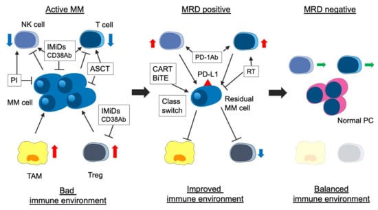 Both the immunological environment and MRD-negativity are essential for long-term survival in patients with MM. The immunological environment may be associated with the MRD status [168]. Previous studies reported that the number of TAM, erythroblasts, Tregs, memory B cells, and CD4+ T cells (especially CD27+) in BM of MRD-positive patients were significantly higher than those in BM of MRD-negative patients [18,82]. Notably, the number of immune cells in PB does not reflect that in BM [18]. Effector Treg, a form of Treg that strongly suppresses immune activity in myeloma cells, exists in the BM tumor site, although there is no significant difference in Treg counts in PB and BM [168,169]. In patients who received ASCT followed by LEN maintenance therapy, NK cells decreased, and exhausted T cells increased in PB of MRD-positive patients compared with that of MRD-negative patients [170]. In addition, the expression of killer cell immunoglobulin like receptor, 2 Ig domains and short cytoplasmic tail 4 (KIR2DS4), which activates immunity, decreased, and that of NKG2A, which suppresses immunity, increased in the MRD-negative patients compared with the MRD-positive patients [170]. Thus, improving the immune environment can contribute to the achievement of MRD, and eradicating residual myeloma cells can balance the immune environment. The correlation between disease status, including MRD status, and immunological environment is shown in Figure 1.