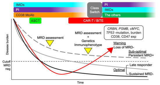 If anti-BCMA CAR-T is available, these agents may be reasonable considering their different modes of action. Meanwhile, immune-activating agents, except anti-PD-1 MoAb, may not be effective because the immune environment is still activated in patients with MRD positivity. Blockade of PD-1/PD-L1 may be necessary as residual myeloma cells express PD-L1. The treatment strategies considering the MRD status are shown in Figure 3. However, analysis and characterization of residual myeloma cells are currently difficult in most hospitals, underscoring the need to consider the resistance to the current anti-myeloma agents. For example, if MRD status is positive during LEN maintenance therapy, the treatment can be changed, including class switching, considering decreased CBRN burden, CBRN mutation, and/or c-MYC upregulation. However, it has also been argued when the treatment should be changed during persistent MRD-positivity considering the possibility of a late responder to current treatment. Data from clinical trials on the current MRD-driven treatment will provide more insights into the effective treatment approaches [172].