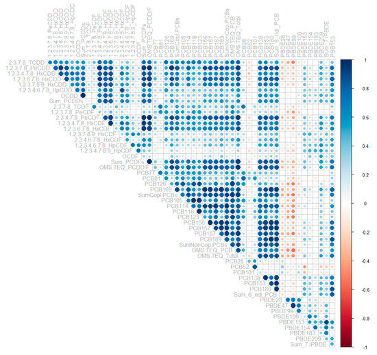 The correlation between POPs, mostly detected in omental fat (PCDD/Fs, PCBs, PBDEs, PBB153), is displayed in Figure 1. The heatmap illustrates the Spearman’s rank correlation coefficient between two congeners. The results showed a very strong correlation between most PCDD/Fs, PCBs and few PBDEs (e.g., PBDE 153 and 209) and PBB153. Some congeners depicted weak or inverse correlation pattern with the rest of POPs, including PBDE 28, 47, 99 or PCB52, 101 (Figure 1).