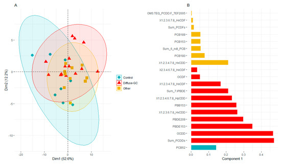 The principal component analysis further indicated that the first and second components accounted for most of model variance (54% and 12%, respectively, for Dim1 and Dim2) (Figure 2A). The individuals displayed in the first two principal components were not homogeneously distributed (Figure 2A). The groups of “diffuse-GC” and “control” appeared to be the most disassociated. Moreover, the sPLS-DA (Figure 2B) showed that -the OCDD and Sum of PCDDs (more abundant in the “diffuse-GC” group), –1.2.3.4.7.8-HxCDD (more abundant in the “other metastatic cancer” group), and –PCB52 (more abundant in the “control” group), were the most discriminant variables.