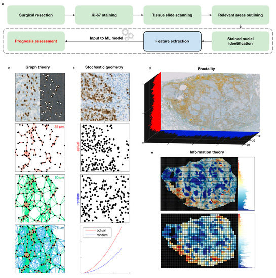 (a) Schematic of the steps of our prognosis assessment framework, from input to output. The lower half blocks represent the core procedures carried out by our software implementation. (b–e) Presentation of the categories of features extracted by our system. (b) Graph theory features rely on the construction of graphs from Ki-67+ cells, considering each cell as a node and connecting two nodes if their mutual distance is lower than a fixed proximity threshold. (c) Ki-67+ cells are interpreted as a stochastic point process; features are derived by measuring how distant the cell spatial arrangement is from a truly random one. (d) Visual representation of the preliminary process for evaluating Higuchi’s fractal dimensions of a sample. For each row and column of pixels of the image, the number of Ki-67+ cells present on that line is counted, and the existence of fractal patterns is then evaluated on the obtained distributions, shown in red and blue in the figure. The measure presented on the axis is exactly the number of Ki-67+ cells found on that pixel row or column. (e) Shannon’s entropy of the Ki-67+ cell distribution. This measure is evaluated by dividing the image in squared sub-regions, counting the number of replicating cells lying inside each window and evaluating the skewness of the corresponding value distribution. This feature is computed for different sub-region sizes, as exemplified in the panel.