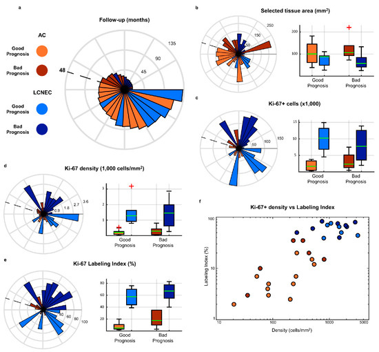 Dataset characteristics. (a–e) Radial plots of samples’ characteristics, each ordered as in (a), to allow comparison; (b–e) also include the corresponding bar plot, grouped by prognostic class and tumour type. (a) Follow-up intervals of patients in months, sorted increasingly counterclockwise. The dashed line represents the separation point between poor prognosis and good prognosis samples, at 48 months. (b) Overall outlined area of the WSI after the outlining procedure, i.e., total area on which the identification of Ki-67-positive cells was then performed. (c) Number of identified Ki-67+ cells. (d) Density of Ki-67+ cells computed over the entire outlined area. (e) Ki-67 Labelling Index, i.e., the manually evaluated percentage of Ki-67+ cells over the total number of cells in an area of ≥2 mm2, or, equivalently, over at least 2000 cells. (f) Relationship between Ki-67+ cell’s density and Ki-67 Labelling Index, each presented in logarithmic scale. Correlation analysis between the two yielded r = 0.51 and p = 0.0032.