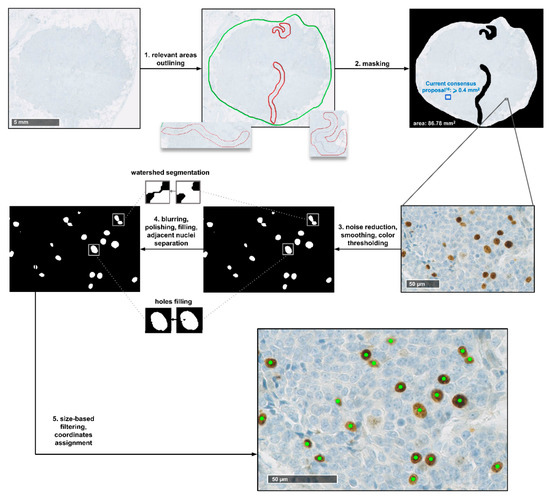 First, 2D median and Gaussian filtering are sequentially applied to the image to perform noise reduction and image smoothing. The kernels employed measure 5 × 5 pixels for 20× images and 3 × 3 pixels for 10× images, with a standard deviation of 0.5 for the Gaussian one. The first stage of the identification process is then carried out at the individual pixel level, detecting brown shaded ones by means of thresholding on RGB channels of the image. The upper threshold on the blue channel is the only parameter that differs between images, to account for hue variability, while every other threshold value is fixed. A binary black and white version of the original image is produced as output of this stage. White pixels are those selected by the thresholding process, i.e., potentially belonging to Ki-67-positive cell nuclei, while every other pixel is set to black. Box blurring—5 × 5 kernel for 20× images, 3 × 3 for 10×—and filtering of isolated white pixels are applied to this binary image for further smoothing and noise reduction. This step is followed by a filling operation, setting to white any black area fully surrounded by white pixels. Watershed segmentation is then performed to identify and split candidate adjacent nuclei that ended up belonging to the same white continuum. Finally, after a last size-based filtering operation, discarding any aggregate considered likely too small or too big to be a cell nucleus, an (x,y) coordinate pair describing its location within the image is assigned to the centroid of each identified positive nucleus.