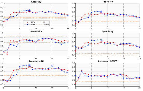 Comparisons of performance metrics between our k-NN and SVM models and the classifiers based on Ki-67 Labelling Index and Ki-67+ cell density. The horizontal axes of the plots indicate the number of top prognostically relevant features employed by our models, ranging from top 3 to top 23. The circles are placed in correspondence to the individual models that obtained the best accuracy; for both k-NN and SVM, these correspond to the model that employed 11 features.