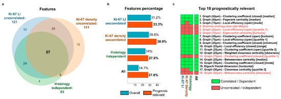 (a) Venn diagram depicting the relationships and overlaps between three relevant sets of features: those uncorrelated with Ki-67 LI (121, in total), the ones uncorrelated with the density of Ki-67+ cells (111) and the histology-independent ones (93). (b) Percentage of features belonging to each of the three mentioned feature sets and to their intersection. Blue bars indicate the percentage among the total 388 features remaining after preliminary filtering, red bars the percentage in the 18 most prognostically relevant. (c) List of the 18 most prognostically relevant features. The corresponding heatmap shows whether they belong to any of the previously presented feature sets (in red) or not (in green).