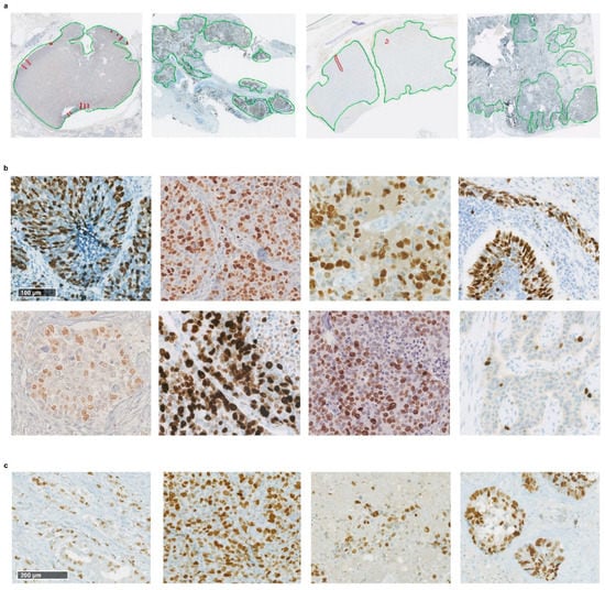Despite the multi-centre dataset, our system proved capable of successfully dealing with WSIs’ heterogeneity on different levels, a challenge strongly enhanced by this multiplicity of sources. This capability constitutes a fundamental feature in a domain where heterogeneity of samples is a key factor that limits repeatability of grade assessment. Figure 6 provides a series of examples of these different layers of heterogeneity, present both between and within WSIs. First, each WSI is unique in terms of shape and number of neoplastic regions in the tissue section (Figure 6a). Because our system derives features that quantify characteristics independent of regions’ shape and size, it is not affected by this variability. Instead, it even exploits heterogeneity at this level, since morphological and textural differences between regions might encode relevant prognostic information. The second and perhaps most challenging heterogeneity factor lies in the variability of colouring and texture between WSIs. Each tissue section is, per se, a unique specimen in terms of morphology, with its own array of cell shapes, sizes and distribution patterns, and antibody staining introduces the additional variable of hue. As the staining procedure is performed manually, variability in colouring can already be observed between samples processed in the same laboratory, especially concerning staining intensity. Furthermore, different laboratories likely employ different immunohistochemical protocols to perform the procedure—i.e., different primary antibody clones, staining platforms, etc. All these elements are recognised to lead to radically diverse results in terms of visual appearance of the WSIs [33,34], as clearly exemplified in Figure 6b. The capability of dealing with such heterogeneous samples demonstrated by our framework represents one of its core strengths. This flexibility is essential when working with rare tumours, since the need to employ multi-centre data is fundamentally unavoidable. Lastly, Figure 6c provides an example of texture and distribution pattern variability within a single tissue slide. This variability, in addition to representing another challenge in the correct recognition of stained cells throughout the entirety of WSIs, provides even further evidence on how limiting it is to exclusively consider a single 0.4 mm2 region—the current consensus proposal [16]—out of all the available tissue for grading, as an unreckonable amount of potentially useful information is completely neglected.