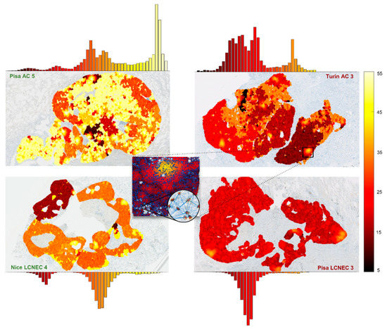 For our model, we employed a ranking-based feature selection method, rather than one yielding a fixed and unordered set of supposedly relevant parameters, to maximise the possibility of gaining meaningful insight from the results. As previously shown, among the most prognosis-relevant ones, we obtained features from the information theory and fractality groups, despite these categories including just four and six features in total, respectively, out of 490. Specifically, Higuchi’s horizontal fractal dimension and Shannon’s entropy for windows of 640 µm2 were significant. The former suggests the presence of fractality patterns in the distribution of the cells, while the latter—which ranked fourth overall—deems relevant the variability of relative concentration of Ki-67+ cells in equal-sized areas of tissue, clearly pointing out a different perspective with respect to accounting for the concentration in a single region. The remaining significant features belong to the graph theory category, with parameters referring to all the three different connection radiuses evaluated, a result that confirms how looking at the cell network’s organisation at different scales did provide relevant insight. These features include a variety of summary statistical indices computed over three sub-categories of graph parameters: centralities, clustering coefficients and efficiencies, all nontrivial indicators of the disposition of the nodes. This heterogeneity within the relevant graph theory features, together with the presence in the ranking of the two features from the small-sized fractality and information theory categories, represents a success for the proposed multi-perspective investigation approach of the replicating cell topology. Combining different techniques to tackle the grading task appears to be viable and effective. We wish, however, to underline how intricate the problem remains, and how nontrivial the interpretation of the results can be. As an example, Figure 7 shows the distribution of eigenvector centrality values for 75 µm graphs in four samples, two GP (one AC, one LCNEC) and two PP (same). The kurtosis of the presented distribution emerged as the sixth most relevant feature in discerning prognostic class among the total 490. This feature can be viewed as a measure of how evenly Ki-67+ cells are distributed throughout the tissue. Higher values indicate a rather uniformly spaced distribution of the cells, while lower ones denote some variability, i.e., the presence of regions with different degrees of intra and/or interconnection. As exemplified in Figure 7, this appears to be often due to large, well-circumscribed areas where nodes present visibly different centrality scores, rather than a general, more scattered unevenness. However, although patterns like this can be observed, for other features as well, we could not identify for any individual feature a defining trait that might appear to provide separation between GP and PP samples by means of that feature alone. Instead, the message that clearly transpires from our observations is that characterising the neoplasm exhaustively enough to assess its prognosis is a rather complex problem, whose solution appears far beyond the capability of either the most comprehensive or specific individual parameter, and therefore in turn of any limited marker such as the traditional Ki-67 LI.