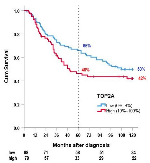 Interestingly, our results indicated that TOP2A expression only correlated with a shorter 5-year OS compared to a 10-year OS (p = 0.039 vs. p = 0.160). This might be due to the fact that many patients with a low TOP2A expression were censored in the follow-up period between five and ten years, which limited the significance of the 10-year OS in this regard.