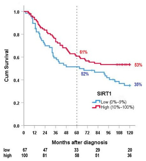 - Noguchi, A.; Kikuchi, K.; Zheng, H.; Takahashi, H.; Miyagi, Y.; Aoki, I.; Takano, Y. SIRT1 expression is associated with a poor prognosis, whereas DBC1 is associated with favorable outcomes in gastric cancer. Cancer Med. 2014, 3, 1553–1561. [Google Scholar] [CrossRef]