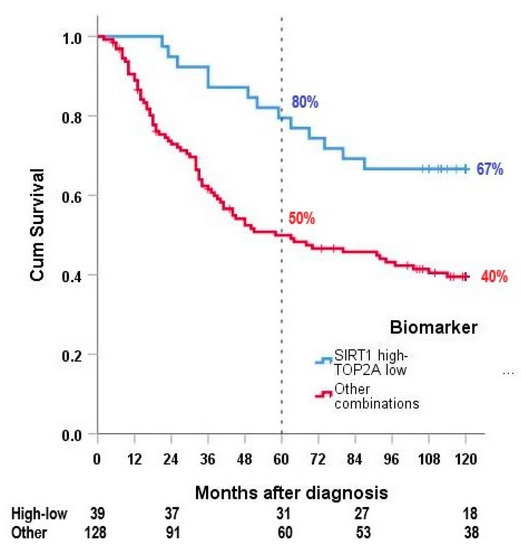In this study, 39 patients (23%) were diagnosed with HR-STS expressing both high SIRT1 and low TOP2A levels. As mentioned before, high SIRT1 and low TOP2A levels favored OS in this patient cohort. This specific “Top survivor” biomarker combination had a significant positive impact on OS (5-year OS 80% vs. 50%, 10-year OS 67% vs. 40%, p = 0.002) (Figure 5).