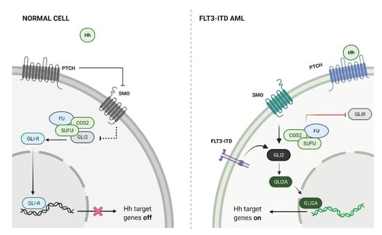 HH pathway activation in FLT3-ITD AML. Constitutive FLT3-ITD kinase activity induces the expression of GLI2, which permits responsiveness to HH ligands (illustrated using BioRender.com, accessed on 14 June 2021).