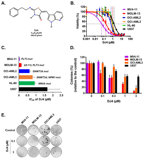 Human AML cell lines are sensitive to DJ4 treatment. (A) Chemical structure of DJ4. (B) Cytotoxic drug response measured using the MTS assay upon DJ4 treatment for 24 h on various human AML cell lines. (C) Corresponding IC50 (µM) values from the MTS assay indicative of the sensitivity of cells with various AML-specific mutations to DJ4. (D) Colony-inhibiting capability of DJ4 on AML cell lines. (E) Microscopic images (4×) of the DJ4-mediated effect on clonogenicity of AML cell lines in a colony growth medium. The data are the means ± standard deviation (SD).