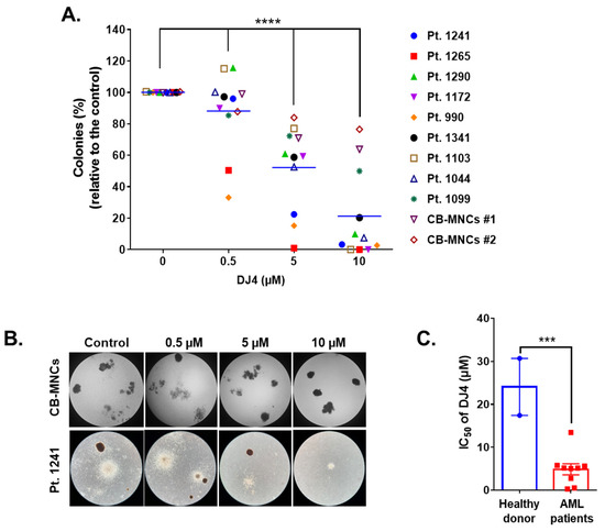 DJ4 reduces clonogenicity in AML patient samples while sparing healthy donor cells. (A) Clonogenicity of the primary AML samples relative to the cord blood mononuclear cells (CB-MNCs) in the presence of DJ4. The data were analyzed via two-way ANOVA (Dunnett’s multiple comparisons test) to compare the grand mean colonies, shown with a blue line, of DJ4 treatment versus the control colonies, wherein **** p < 0.0001 was considered significant. (B) Representative microscopic images (4×) illustrating the number of colonies with increasing DJ4 concentrations in AML primary patient sample 1241 versus the control CB-MNCs. (C) Extrapolation of the IC50 (µM) values from the colony-forming assay in (A). The results were assessed by means of the unpaired t-test and *** p < 0.001 was considered significant. The data are the means ± SEM.