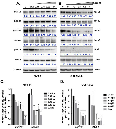 The effect of DJ4 treatment on the phosphorylation of ROCK downstream targets, MYPT1 and MLC2, was assessed. The AML cell lines, MV4-11 and OCI-AML3, were treated with DJ4 in DMSO (0–1 μM). The whole cell lysates were prepared after 24 h of drug treatment and analyzed via immunoblot analysis (Figure 4). Upon treating MV4-11 (Figure 4A) and OCI-AML3 (Figure 4B) with increasing concentrations of DJ4, the levels of phosphorylated MYPT1 and MLC2 were reduced in a dose-dependent manner relative to the loading control GAPDH (Figure 4C,D) while retaining the levels of unphosphorylated analogs of these substrates and ROCK1 and ROCK2. Additionally, lower concentrations of DJ4 were needed to significantly reduce the levels of phosphorylated MYPT1 and MLC2 in MV4-11 (0.04–0.06 μM) versus OCI-AML3 (0.6–1 μM). This behavior of increased sensitivity of MV4-11 to DJ4 versus OCI-AML3 is comparable to what was observed with the aforementioned cytotoxicity and apoptotic assays (Figure 1B–E and Figure 3A). This supports the in vitro studies by Kale et al. who demonstrated the potency of DJ4 to selectively inhibit ROCK1/2 and MRCKα/β in various human cancer cell lines. [50]. Similarly, DJ4 inhibited the activity of MYPT1 and reduced the levels of MLC2 [50].