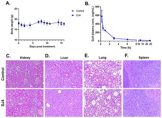 DJ4 was formulated in DMSO; thus, the maximum tolerated dose (MTD) was conducted via intraperitoneal injection. The MTD was established to be 10 mg/kg. The mice were then treated with the DMSO vehicle (n = 5) and 10 mg/kg DJ4 (n = 5) I.P. for 2.5 weeks, wherein the drug was administered once a day for 5 days with a 2-day break in a cycle. Drug treatment had a negligible impact on the body weight (less than 10% of the body weight lost), and no signs of illness were observed over time (Figure 5A, Table S2). The control and DJ4 treatment groups had comparable complete blood counts (CBC) with differential values suggesting drug treatment did not cause severe underlying conditions (Table S3). A metabolic panel to analyze renal function (CREA and BUN), liver function (ALKP, ALT, and AST) and common electrolytes in the blood collected from the control and DJ4 treatment groups was also examined (Table S4). The similar values from the chemistry panel between the groups indicate the levels of glucose, fluid, and electrolytes or the function of kidneys, liver, and other organs were not adversely affected by DJ4 (Table S4). Pharmacokinetic analysis indicated that approximately one hour after I.P. administration of DJ4 (10 mg/kg) ~50% of the drug remained in the blood, and after three to six hours, the level of DJ4 in the blood was negligible (Figure 5B). Further, H&E staining of the kidney, liver, lung, and spleen tissues of the mice treated I.P. for 2.5 weeks with DMSO or DJ4 indicated the cell and organ morphology was not affected by drug treatment (Figure 5C–F). Thus, the mice tolerated 10 mg/kg DJ4 via I.P. administration without any overt signs of illness and harmful effects to their system.