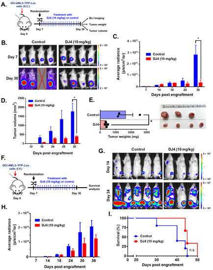 Cell line-derived xenograft (CDX) models were established with OCI-AML3–yellow fluorescent protein (YFP)–luciferase (Luc) and MV4-11-Luc2–enhanced green fluorescent protein (EGFP). The luciferase-expressing leukemia cell lines were subcutaneously (S.C., 2–2.5 × 106 cells) or intravenously (I.V., 2–2.5 × 106 cells) administered to 8–12-week-old NOD.Cg-Rag1tm1Mom Il2rgtm1Wjl Tg(CMV-IL3,CSF2,KITLG)1Eav/J (NRG-S) mice (The Jackson Laboratory, Bar Harbor, ME, USA) and the disease progression was monitored with bioluminescence imaging (BLI) as previously established [51,52]. The mice were randomized based on the BLI signal, segregated into either control or treatment groups, and intraperitoneally treated with DMSO or DJ4 (10 mg/kg) for 3 weeks. The in vivo studies initially included extra mice, with outliers in engraftment being removed, to ensure no variability in the leukemia burden among the mice within the control and DJ4 groups prior to randomization. Treatment was performed in a continuous cycle administering DJ4 once a day for five days followed by a two-day break. The murine studies were repeated at least twice. Whole-body leukemic burden was quantified using the Living Image software (Perkin Elmer). Overall survival was monitored, and Kaplan–Meier analysis was carried out. Over the course of the study (subcutaneous model studies), the tumor volume (mm3) was measured with calipers, and towards the conclusion of the study, the tumors were isolated and weighed (g).