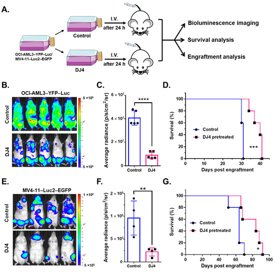Disease progression and survival analysis of the mice that were intravenously injected with the AML cell lines that were pretreated with DJ4 for 24 h. (A) The modified AML cell lines, OCI-AML3–YFP–Luc and MV4-11–Luc2–EGFP, were treated with their respective IC50 dose of DJ4 (Figure 1B,C) or with the vehicle for 24 h. The treated cells were then intravenously administered to the NRG-S mice, and the survival advantage was monitored over time without further treatment. The mice were imaged every few days to visualize and quantify disease progression. Flow cytometry analysis on the bone marrow and spleen tissues of the vehicle- and DJ4-treated mice was also performed to track disease progression by measuring the percentage of engraftment of the human cancer cells (see Figure S8). (B) Imaging on day 25 of the DJ4-pretreated OCI-AML3–YFP–Luc-injected mice versus the control group. (C) Bioluminescence imaging measured by the average radiance (p/s/cm2/sr) on day 25 of the DJ4-pretreated OCI-AML3–YFP–Luc-injected group versus the control mice. (D) Survival observed among the mice that received the OCI-AML3 cells that were pretreated with DJ4 versus DMSO. (E) Imaging on day 38 of the MV4-11–Luc2–EGFP-injected mice that were pretreated with DJ4 versus DMSO. (F) The average radiance observed on day 38 in the MV4-11 cells that were pretreated with DJ4 as compared to the DMSO-pretreated mice. (G). Kaplan–Meier survival analysis of the DJ4-pretreated MV4-11-injected mice relative to the DMSO-pretreated MV4-11-injected mice. The data are the means ± SD. The values in (C,F) were assessed by means of the unpaired t-test, with ** p < 0.01 and **** p < 0.0001 considered statistically significant. The results in (D,G) were examined by means of the Gehan–Breslow–Wilcoxon test, wherein * p < 0.05 and *** p < 0.005 were considered statistically significant.