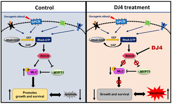 ROCK inhibitors such as DJ4 may reduce the phosphorylation of downstream targets such as MLC2 and MYPT1. Blocking ROCK-related pathways can potentially have therapeutic benefits by restoring proliferation and apoptotic cascades that may be improperly signaling due to malignant transformations arising from cancer.