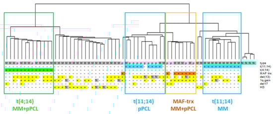 Hierarchical clustering analysis of gene-expression profiles of 50 MM (grey), 15 pPCL (pink) and 4 N samples (green). Samples are grouped according to the expression levels of the 2402 most variable transcripts (varying at least 2-fold in expression levels from the mean across the dataset). Main molecular alterations are shown; N indicates data not available. The specific types (N = normal control, M = MM, p = pPCL) are enriched by colored sub-branches, also highlighted by the appropriately colored box (see text).