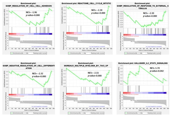 In detail, among the significantly enriched gene sets (Table S5), we evidenced that the t(11;14) pPCL group was negatively associated with the regulation of cell–cell adhesion, response to external stimuli, and the negative regulation of cell differentiation. GSEA also demonstrated for the t(11;14) pPCL cases a negative association with the signature defined by high TACI expression level in MM by Moreaux et al. [25] (Figure 2 and Table S6). On the contrary, they were significantly enriched in genes involved in IL2-STAT5 signaling.