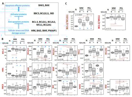 (A) Scheme of the BCL2 family protein interactions. (B) Box plot representation of the mRNA expression of BCL2 family genes in 4 normal controls (N), 12 MM patients carrying t(11;14), 38 MMs without t(11;14), 7 pPCL patients carrying t(11;14), and 8 pPCLs without t(11;14) evaluated by GeneChip® Human Gene 2.0 ST array (GSE116294). (C) Box plot representation of the ratio BCL2/BCL2L1 and BCL2/MCL1 expression in each group. In each panel, red dashed lines below/above two groups indicate significant differences in their gene expression level; blue asterisks indicate significant differences between the indicated group and N (Dunn’s test p-values are reported in Figure S2). BH adjusted Kruskal–Wallis test p-value is reported for each panel.
