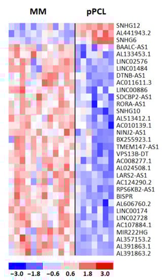 Heatmap of the 33 differentially expressed lncRNAs in 12 MM and 7 pPCL patients with t(11;14) chromosomal translocation. The colored scaled bar represents standardized rows by subtracting the mean and divided by the standard deviation.