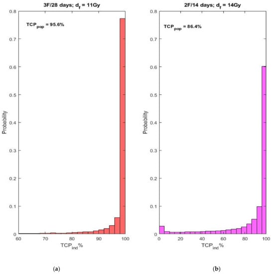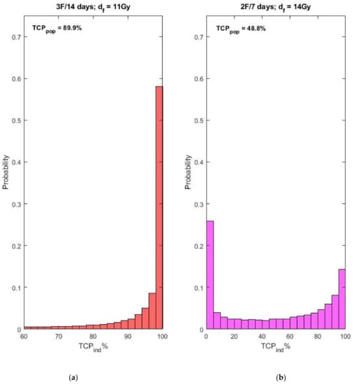 Individual TCP distributions obtained for the parameter values shown in Equations (6) and (7) for shortened schedules. (a) Individual TCP distribution for the three fractions in 14 days regimen; (b) Individual TCP distribution for the two fractions in 7 days regimen.