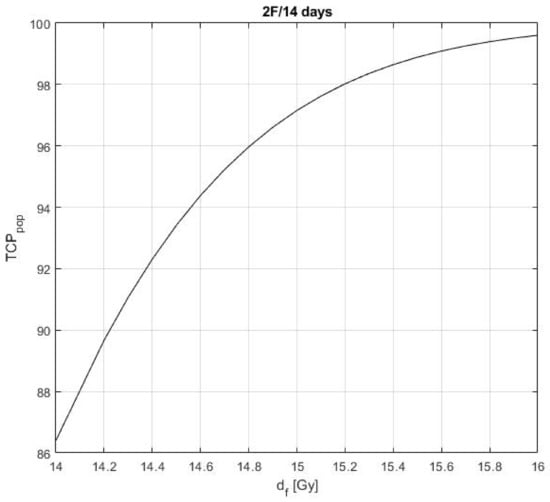 After determining the values of resulting in the clinically observed outcomes, we checked the impact of an increased dose per fraction on the population TCP2F. The result is shown in Figure 2.